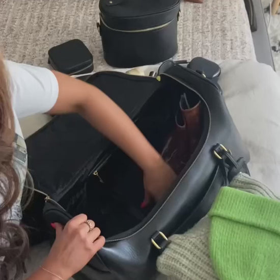 The Weekender Bag doubles as the perfect travel bag for quick getaways and the perfect hospital bag for expecting mamas! The roomy interior features nylon lining and can fit clothing, pajamas, shoes, slippers, and more. The bag has a variety of interior pockets to keep all of your accessories organized, from cosmetics and skin care to accessories like sunglasses, socks, scarves, etc.