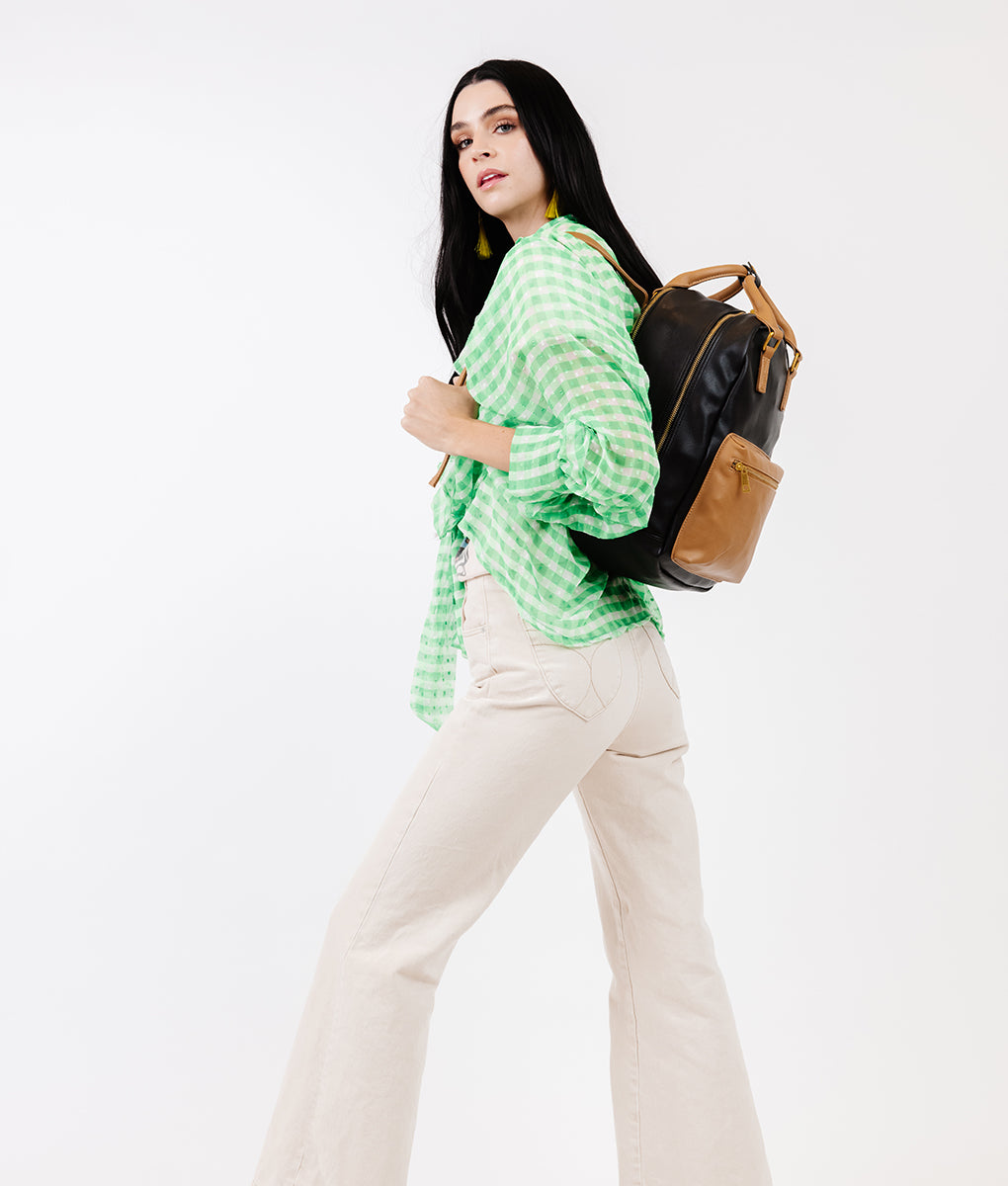 The Fawn Diaper Pack features a classic backpack silhouette with contemporary updates. This two-tone diaper bag features a double-chamber design that opens wide for easy packing and access. The bag has a variety of pockets including a large front pocket, two interior bottle pockets, and a back padded pocket for electronics. The Diaper Pack was designed for modern parents who want a stylish, non-traditional diaper bag.